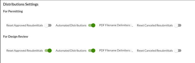 The Distribution Settings control what EPR does with assignments whenever files are received, which includes defining how EPR will treat resubmitted files that previously had an “Approved” or “Canceled” assignment status. Distribution settings are broken out by purpose, so if a client is using both “For Permitting” and “For Design Review” purposes, they can either configure the same or different settings for each.