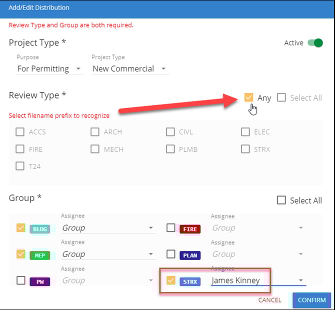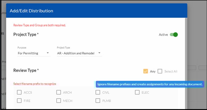 The Review Type can also be ignored altogether. If an agency is not requiring specific file naming conventions, it’s best to check the box for Any under Review Type. As mentioned by the tooltip, this creates whatever assignments are configured as part of the active distribution regardless of what the file name is.