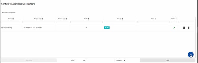 The Automated Distributions feature is designed to help agency staff populate assignment suggestions on the Intake page automatically based on the type of project whenever assignment information is not already being passed along by an integrated permitting system. Users can access this feature by navigating to Settings > Configurations > Distributions.