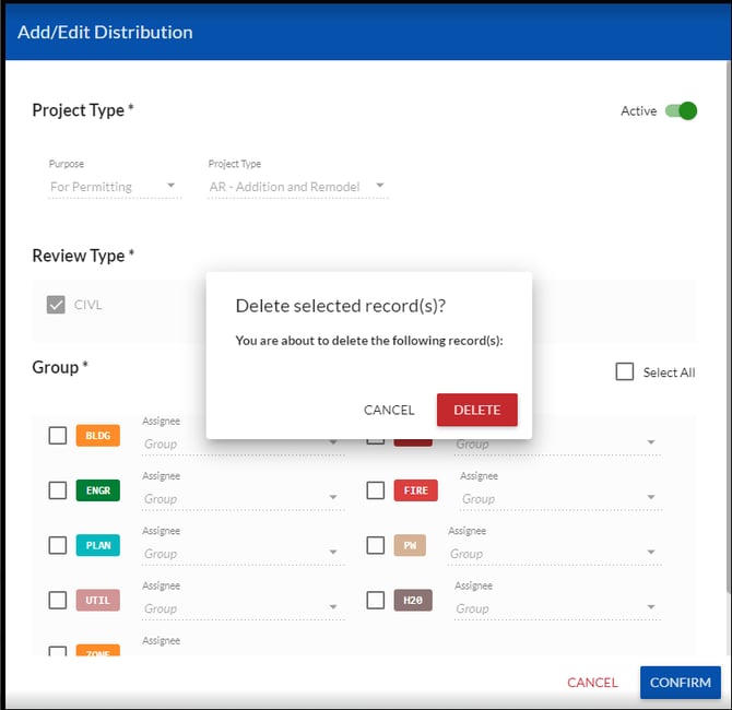 Removing a group from the distribution record will prompt a message box asking you to confirm this choice by clicking DELETE.