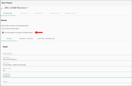 Under “INFORMATION”, select the option Yes, this project is a revision of another project.