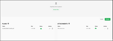 Applicants will then have the option to move any PDF files over to the “ATTACHMENTS” section manually if appropriate. Each type of file is processed and stored differently within e-PlanREVIEW® (EPR) as detailed below, so make sure that files have been categorized correctly before clicking Process to complete the upload.