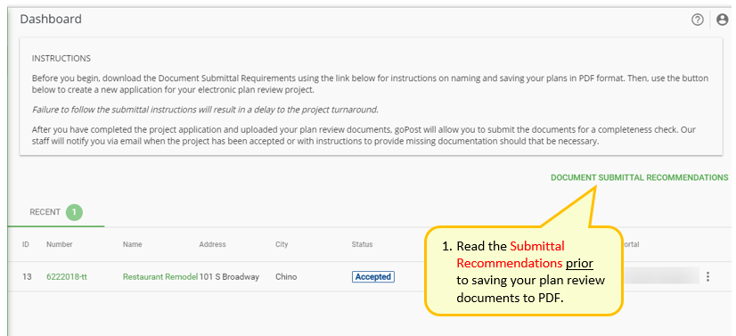 Applicants will use the goPost™️ Public Portal (goPost) to create, submit, and track project applications with the approving agency. Applicants should review the Document Submittal Recommendations to understand how to prepare files for submittal to an agency for electronic plan review.